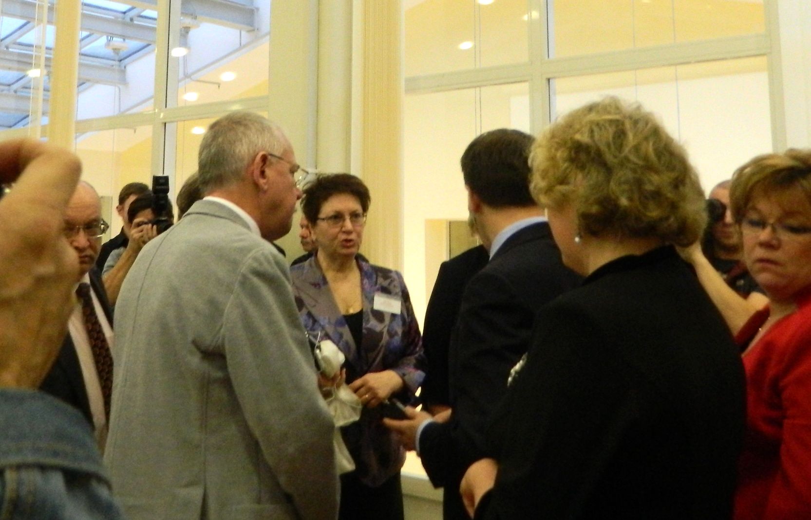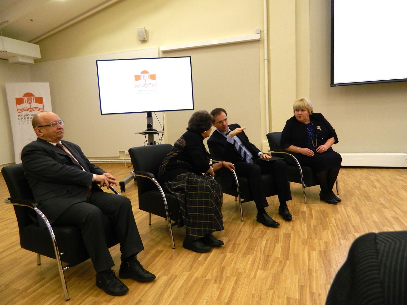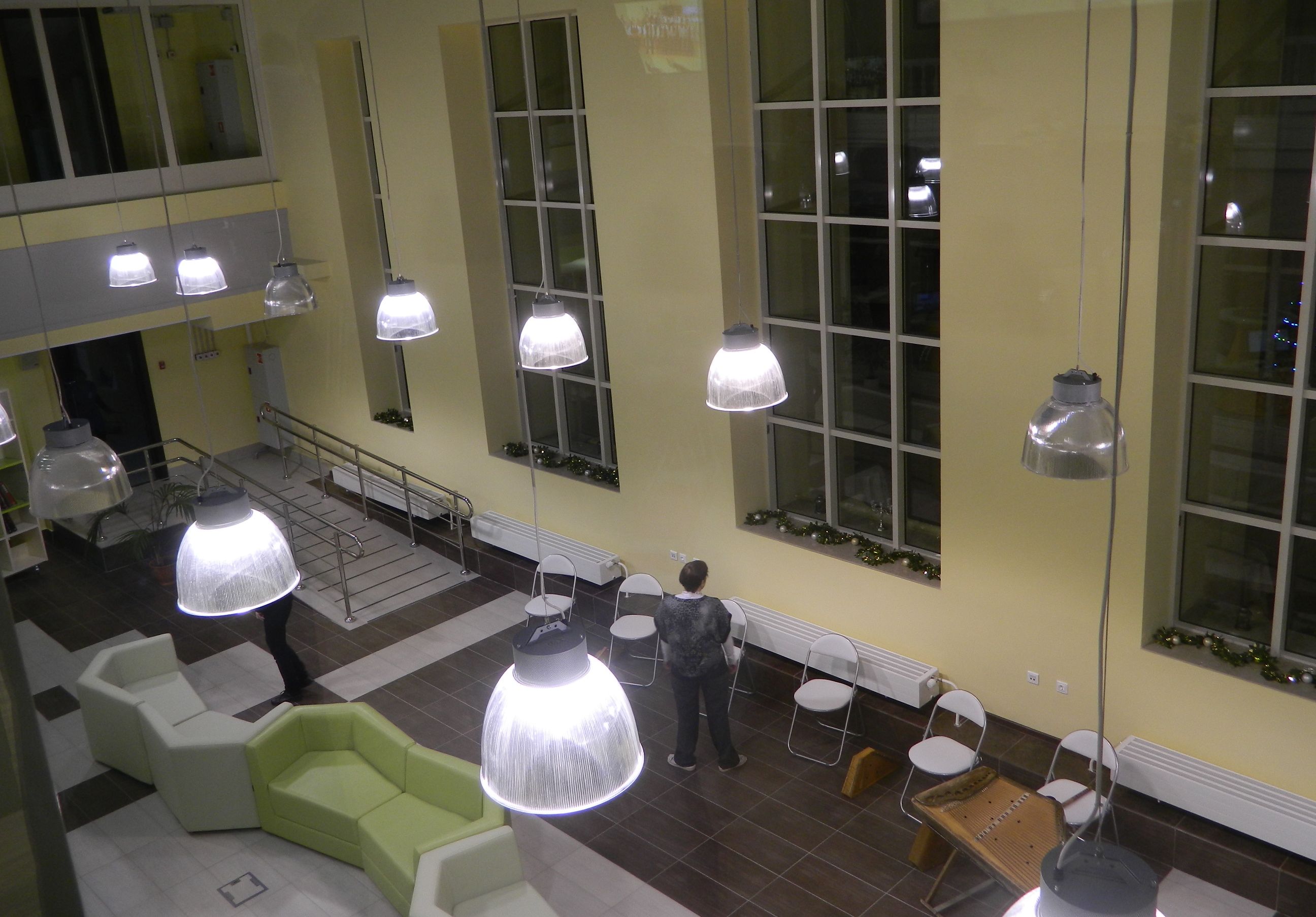 Гости, к сожалению, не смогли увидеть то, что видел министр — книгохранилище, но зато за два часа ожидания смогли детально познакомиться с новым мультимедийным конференц-залом. Помещение просторное, ангарного типа: кабели убраны в трубы, которые тянутся по стенам. Оконные проемы плотно закрыты, свет и воздух через них не проникают, но есть принудительная вентиляция, которая отключена. В зале очень душно. Но есть три экрана, и система видеоконференц-связи работает хорошо, по крайней мере, связь с Президентской библиотекой была отличной.