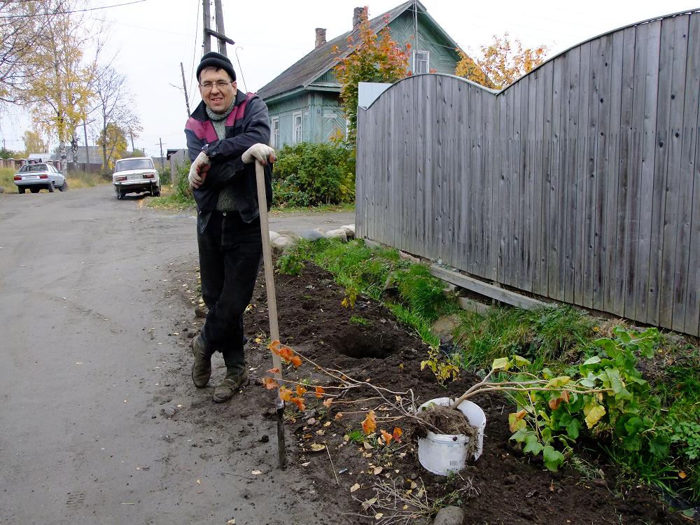 Сам Андрей до начала разговора был занят – сажал у забора кусты смородины, причем не на своем участке, а именно на улице.