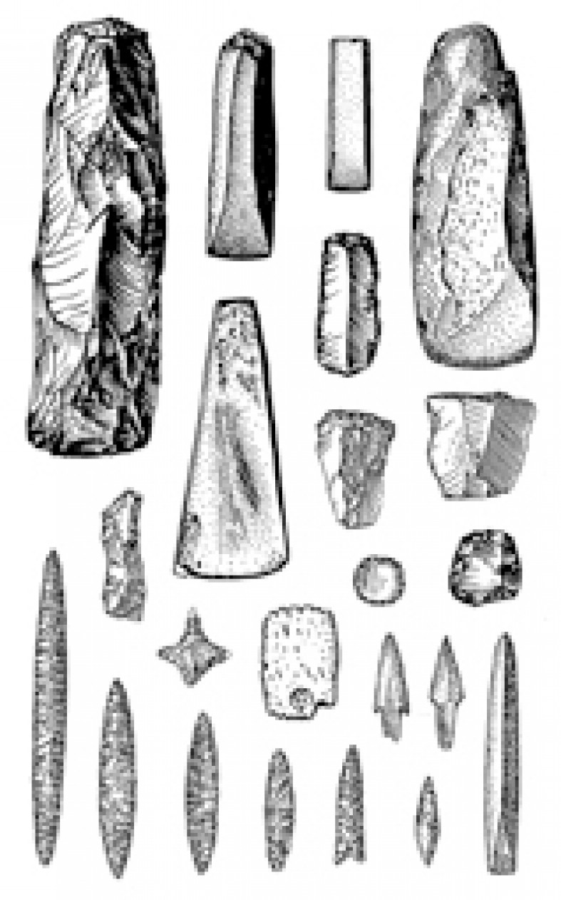 ЭНЕОЛИТ, халколит, медный век (нач. 3—2-я пол. 2 тыс. до н. э.), переходный период от каменного к бронз. веку, время использования самородной или выплавленной из руды меди. На терр. Карелии в этот период существовали 2 археол. культуры: ромбоямочной и асбестовой керамики. Поселения, где была известна более ранняя ромбо-ямочная посуда (нач.—кон. 3 тыс. до н. э.), концентрировались на побережье озер Онежское и Водлозеро, в басс. Белого моря, в верховьях р. Суны. За пределами Карелии аналогичная посуда распространена к Ю. и Ю.-В. от Онежского оз., а также в верх. и ср. теч. р. Десны и в верховьях р. Оки. Поселения пл. 200—10 000 м2 обычно вытянуты вдоль древнего берега водоема. Жилища прямоугольной формы, иногда соединены коридорами, углублены в землю и расположены в 1—2 линии на небольшом расстоянии друг от друга. Стенки сложены из горизонтально лежащих бревен. Очаги размещены в ц. или у выходов. Поселения без жилищ, с очагами (из сооружений — хоз. ямы и каменные кладки неясного назначения) использовались, видимо, в летнее время. Глиняная посуда представлена преим. крупными круглодонными лепными непрофилированными горшками, миниатюрные чашечки и плоскодонные сосуды редки. Орнамент состоит из ромбических или овальных ямок, сделанных в шахматном порядке, и горизонт. полос гребенчатых штампов, реже встречаются сложные геометрические узоры. Мн. каменных изделий традиц. форм (сланцевые рубящие, кирки и киркообразные орудия, скребки, наконечники стрел, украшения). Появились клевцы (разновидности боевого топора), желобчатые и когтевидные доло-та (круммейсели), инстр-ты, связанные с добычей и обработкой меди, — крупные отбойники и кайла. Поселения, где была распространена керамика, содержащая примесь органики и асбеста, существовали со 2-й пол. 3-го до 2-й пол. 2 тыс. до н. э. За пределами Карелии аналогичные пам. распространены на обширных терр. лесной зоны от Балтики до Урала, составляют гр. культур волосовского типа. Топография поселений не изменилась. Пл. большинства пам. 700—3 000 м2. Жилищные впадины расположены в 1—2 ряда. Большинство жилищ прямоугольные (с 2 очагами и выходами) или квадратные (с 1 очагом и выходом), углубленные в землю на 40—60 см. На поселении Залавруга 2, в низовье р. Выг, вскрыто погребение, содержащее янтарные украшения и кремневые наконечники стрел. Материалы пам., принадлежащих к культуре асбестовой керамики, представлены фрагментами сосудов с примесью асбеста или органики, каменными орудиями и украшениями, янтарными и медными изделиями, предметами мелкой пластики. Посуда с круглым, уплощенным или плоским дном вылеплена из глины с примесью асбеста, органики или их смеси. В материалах ранних пам. керамика близка к предшествовавшей гребенчато-ямочной; предметы более поздних памятников — сосуды — украшены елочкой из оттисков гребенчатых штампов или веревочными отпечатками, наколами, ногтевыми и трубчатыми вдавлениями, неглубокими ямками. Пропорции сланцевых рубящих орудий стали удлиненными, появились топоры и тесла рус.-карел. типа, увеличилось кол-во желобчатых долот и круммейселей. Значительно возросло число наконечников стрел, появились новые их виды из сланца и шифера — с усеченным основанием и выемками, длинные узкие с уплощенным насадом, треугольно-черешковые с шипами, удлиненно-треугольные с выемкой в основании. Увеличилось поступл