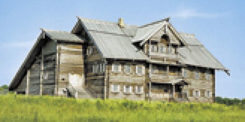 СÉРГИНА ДОМ из д. МУНОЗЕРО Медвежьегорского р-на, пам. дерев. зодчества (см. Дома крест. традиц. и Конструкции в дерев. зодчестве). Один из самых больших домов-комплексов Карелии, образец заонежского традиц. жилища. Срублен в 1870-х зажиточным крестьянином Л. Я. Сергиным. Являлся композиционной доминантой 1-рядной застройки малодворного поселения, расположенного на проселочной дороге на крутом перепаде рельефа. Передан музею-заповеднику «Кижи» последней хозяйкой — Е. М. Мешковой (урожденной Сергиной). Перевезен на о. Кижи, в д. Васильево, в 1972 отреставрирован Карел. специальной научно-реставрационной производств. мастерской. Обмеры выполнены Д. Г. Сафоновой, уточнены А. В. Ополовниковым. Дом типа «кошель» (переходной от «глаголя» формы) с взаимоохватом жилой и хоз. частей, перекрытых общей разноскатной крышей. Двухэтажная жилая ч. организована по принципу 2-конечного дома и включает на каждом этаже по 2 избы и одной горнице, объединенных сенями. Справа от сеней размещались избы, смежные с горницами, изба на 2-м этаже служила  парадной  «залой».  Лев.  изба 2-го этажа предназначалась для молодых девушек, 1-го — для брата строителя дома — старообрядца М. Я. Сергина; с 1896 по 1920-е использовалась как странноприимный дом. В мезонине и на чердаке дома — 2 светелки, служившие клетями. Двухэтажный Г-образный в плане двор-сарай смещен по отношению к жилищу как в горизонт., так и в вертикальном направлении и связан с сенями внутр. черной лестницей. Во дворе размещались срубы хлевов, в сарае с вывешенным на столбы озадком — 2 встроенные кладовые для продуктов; в одной из них прежде находилась бакалейная лавка. Въезд на сарай осуществлялся через ворота по взвозу, обращенному к дороге. Особенности объемно-планировочного решения позволили использовать функциональные преимущества «кошелей» (просторность и компактность осн. помещений двора-сарая), увеличить ср. высоту сарая и емкость сеновала за счет взаимосмещения по высоте жилой и хоз. частей. Симметрия гл. фасада дома подчеркнута 2-ярусной входной галереей и балконом светелки-мезонина, смягчена дисимметричным смещением крыльца вправо от центр. оси жилого передка и лев. выступом хоз. ч. дома, акцентированным воротами и взвозом сарая. Характер декор. убранства представляет собой соединение традиц. и заимствованных извне (городских) форм и мотивов.