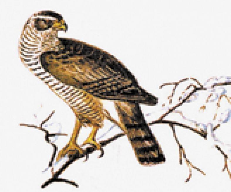 ЯСТРЕБÁ (Accipiter), род птиц сем. ястребиных отр. хищных. В Карелии повсеместно встречаются 2 вида — Я.-тетеревятник и Я.-перепелятник. Птицы ср. размера, тетеревятник более крупный. Общий тон окраски от серого до бурого. Верх тела окрашен темнее. У взрослых самцов перепелятника верх тела сизый, а низ беловатый с бурым или рыжеватым рис. На затылке белое пятно. У взрослых птиц обоих видов низ тела, маховые и рулевые перья покрыты поперечным рисунком. У молодых пестрины продольные. Самки заметно крупнее и тяжелее самцов. Короткие широкие крылья, длинный хвост (руль) и удлиненные ноги приспособлены для стремительных перемещений по лесу и к особой манере охоты. Обнаружив во время облета своей терр. или с присады в кроне дерева гр. кормящихся птиц или выводок, Я. «падает» вниз и, лавируя между куртинами подроста, подлеска или даже среди густой травянистой растительности у самой земли, незаметно подбирается к птицам, делает резкий бросок в сторону намеченной жертвы и хватает ее на взлете. Благодаря очень длинным ногам Я. удается схватить добычу даже внутри крон деревьев. Тетеревятник может успешно добывать разнообразных животных (от полёвки до тетерева и зайца). Объекты охоты перепелятника — преим. мелкие птицы, хотя самки могут добывать белок и рябчиков. Я. строят гнезда на разл. деревьях в 3—15 м над землей. Кладка состоит из 4—5 яиц, но успешно выкармливаются только 1—4 птенца. Птицы обоих видов очень привязаны к своей терр. и могут использовать гнезда в теч. мн. лет. Перепелятники и даже тетеревятники иногда селятся на окраинах крупных городов. Здесь объектами охоты Я. с осени до весны являются в осн. сизые голуби и ворóны, в летнее время — разнообразные виды птиц. Взрослые тетеревятники, в отличие от молодых, на зиму не покидают своей терр. Перепелятники являются мигрантами, случаи их зимовки в Карелии чрезвычайно редки.