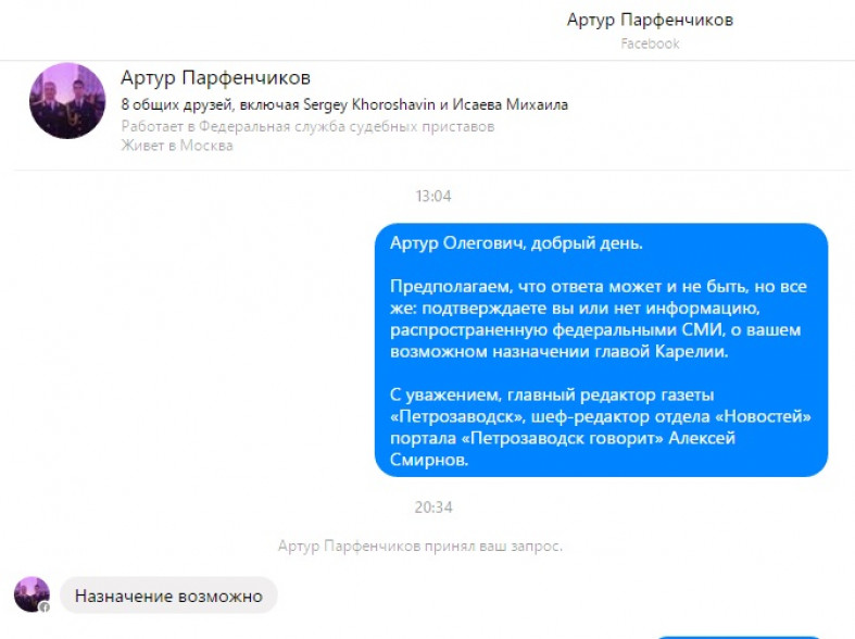 Глава ФССП России Артур Парфенчиков через messenger facebook коротко прокомментировал порталу "Петрозаводск говорит" информацию, появившуюся в СМИ о своем возможном назначении главой Карелии.