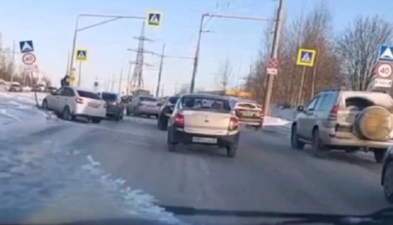 Водитель машины, следовавшей за ним, судя по всему, попытался уйти от столкновения и выехал за пределы дороги. В итоге автомобиль «Лада» наехал на дорожный знак. // скриншот записи сообщества «Подслушано у водителей Птз и Карелии»