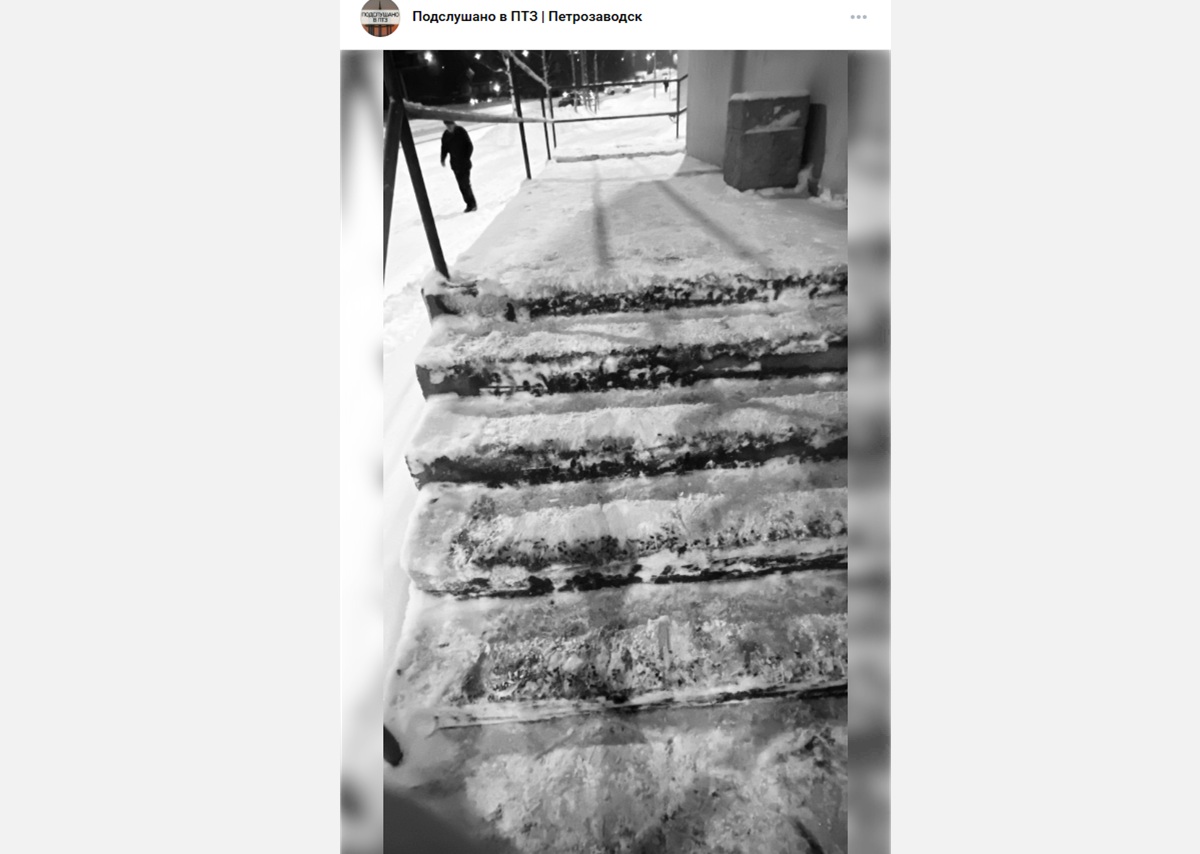 Судя по опубликованной в сообществе фотографии, ступеньки лестницы не были обработаны каким-либо противоголедным средством.
