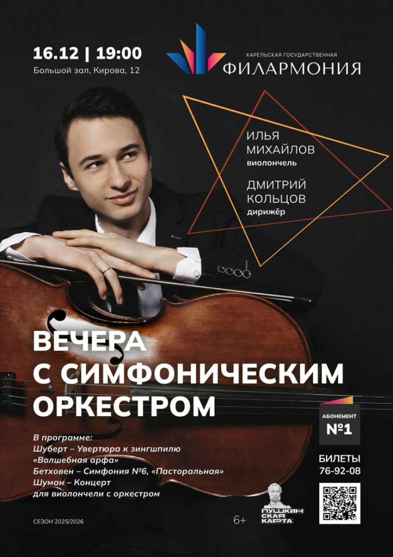 Заключительный концерт первой серии абонемента «Вечера с Симфоническим оркестром» называется «Илья Михайлов. Дмитрий Кольцов», это четвёртая встреча в сезоне 2025/2026. Солист вечера – Илья Михайлов (виолончель, Москва). Он признан лучшим выпускником года Московской государственной консерватории им. П.И. Чайковского (2024), является лауреатом нескольких международных конкурсов, в числе которых Международный музыкальный конкурс им. Р. М. Глиэра (2022; I премия) и Всероссийский открытый конкурс-фестиваль исполнительского искусства им. М. М. Ипполитова-Иванова (Москва, 2020; II премия).