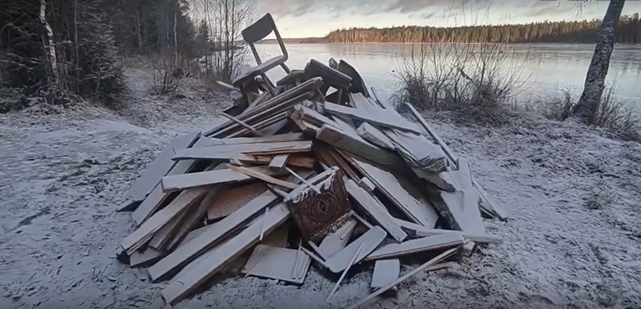 Он снял на видео покрывающееся льдом озеро Лососинное: «Тишина, благодать». Но гармонию нарушили сваленные в кучу доски, стулья, тазики, игрушки, сиденье для ванны и другой хлам.