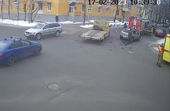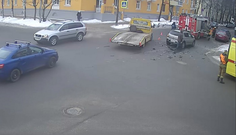 Автомобили жестко столкнулись в центре Петрозаводска сегодня утром. Авария произошла около 9:33 на пересечении улиц Гоголя и Герцена в районе пешеходного перехода.