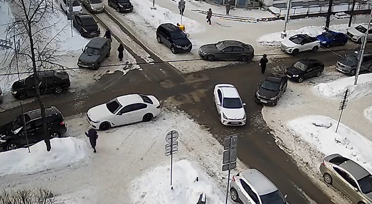 Курьер доставки с ящиком известного логистического сервиса двигался по тротуару и въехал в машину, которая, судя по всему, стояла в том месте, где перекресток Дзержского-Свердлова переходят пешеходы. Курьер поднял свой велосипед, обогнул автомобиль и поехал дальше в сторону Карла Маркса, но уже по проезжей части. Момент дорожного инцидента запечатлела камера наблюдения.