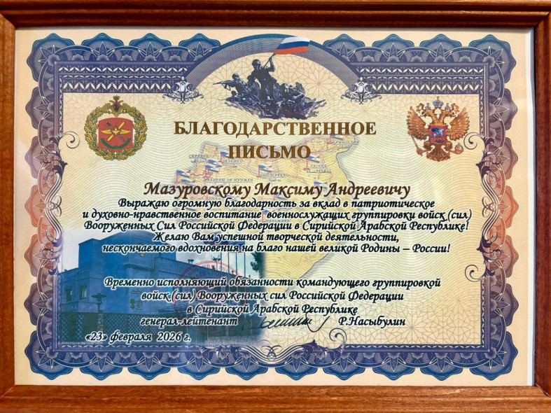 - С учётом того, что последний раз перед военнослужащими в Сирии кто-либо выступал более полугода назад, и они там фактически закрыты на наших базах месяцами, нас принимали очень тепло. После выступления 23 февраля и.о. командующего нашей группировки в Сирии пригласил нас на полуночный разговор с ним и его заместителями. Генерал-лейтенант очень тепло благодарил нас и даже спел песню. До этого на сцене дома культуры на базе он вручил нам благодарственные письма за вклад в духовно-нравственное воспитание военнослужащих группировки войск Вооруженных сил России в Сирийской Арабской Республике.