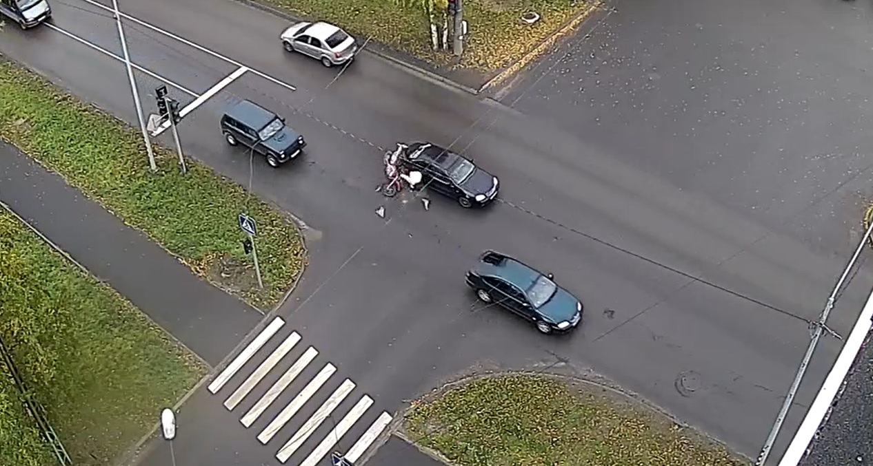 Мотоциклист сделал сальто после того, как влетел в легковой автомобиль на перекрестке в Петрозаводске. Момент удара и акробатического движения запечатлела городская камера наблюдения.