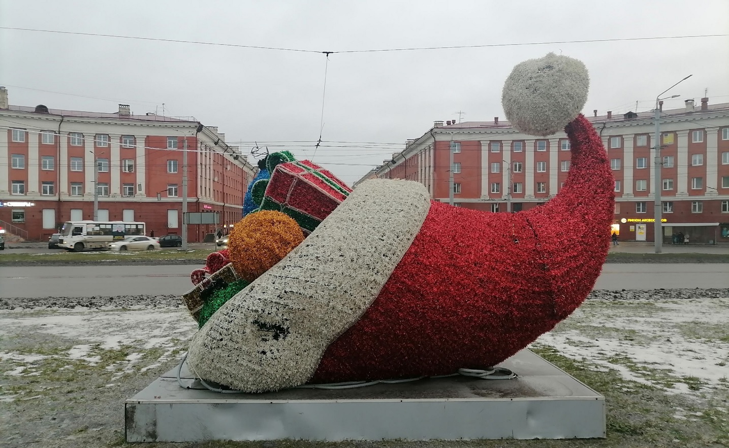 Петрозаводск почти нарядился к празднованию Нового года. На площади Гагарина установили декоративный элемент в виде новогодней шапки, наполненной подарками. Когда-то эта конструкция стояла на площади Кирова, и, очевидно, с годами пообносилась.