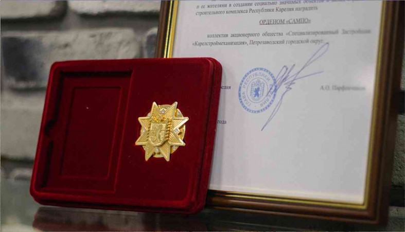 Указом Главы Республики Карелия «За высокие достижения и заслуги перед Республикой Карелия и её жителями в создании социально значимых объектов и вклад в развитие строительной отрасли Республики Карелия» коллектив АО «Специализированный Застройщик «КСМ» награждён высшей государственной наградой республики – Орденом «Сампо».