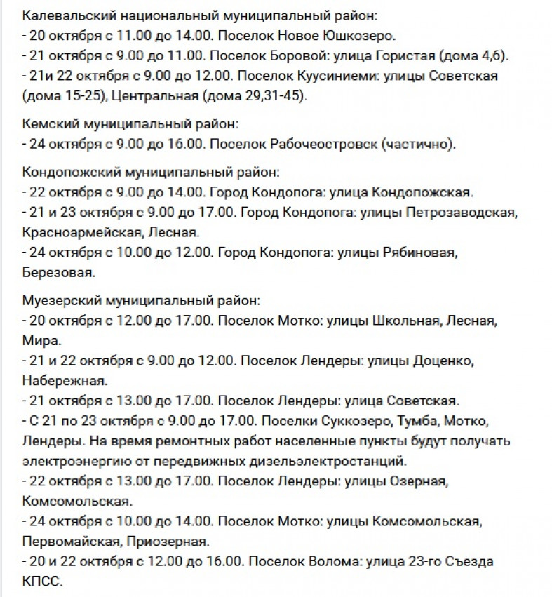 Так, на следующей неделе без света на время останутся жители Сегежского округа, Калевальского, Кемского, Кондопожского, Муезерского, Медвежьегорского, Прионежского, Пряжинского, Лахденпохского районов.