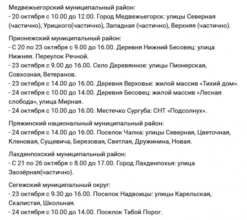 На неделе с 20 по 26 октября сотрудники «Прионежской сетевой компании» продолжат работы по модернизации электросетей в республике. В связи с этим в ряде территорий ожидаются отключения электричества, сообщает паблик предприятия.