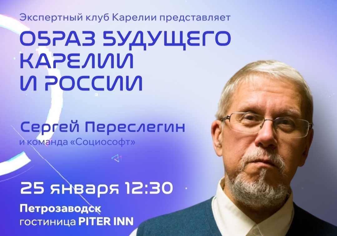 25 января с 12:30 до 18:00 Экспертно-дискуссионный клуб Карелии проведёт открытый семинар «Образ будущего Карелии: форпост Русского Севера» (12+) с участием российского аналитика и прогнозиста Сергея Переслегина, руководителей республики, региональных экспертов и общественных деятелей. В гостинице «Питер ин» эксперты представят итоги годовой работы клуба по формированию стратегического видения будущего Карелии на основе её культурного кода.