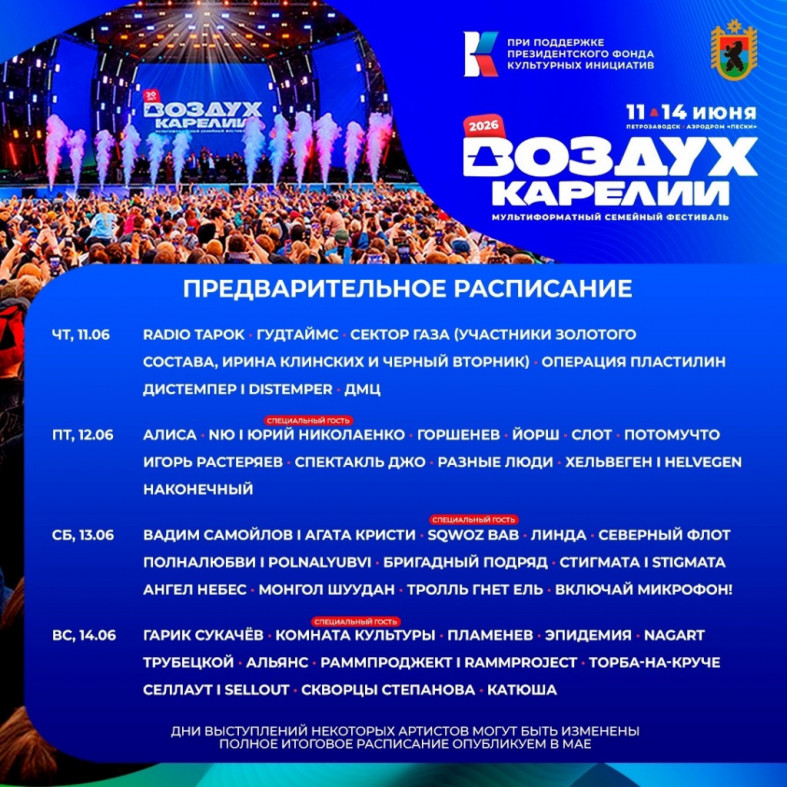 Организаторы фестиваля «Воздух Карелии» (возрастное ограничение 0+) опубликовали обновленное предварительное расписание выступлений с учетом новых объявленных участников.