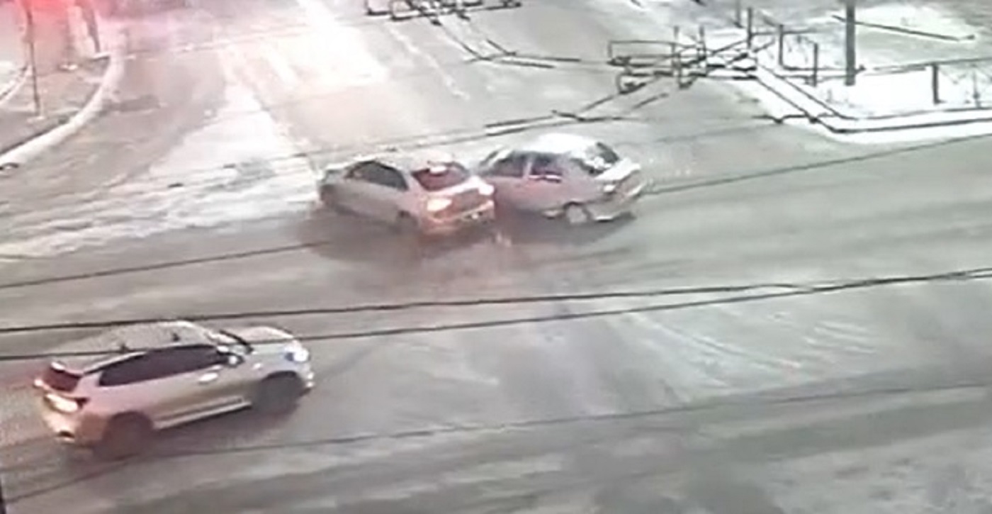 Все случилось в 20:46. На кадрах видно, как автомобиль, ехавший прямо, врезался в машину, совершавшую левый поворот. При этом один из участников аварии летел на красный.