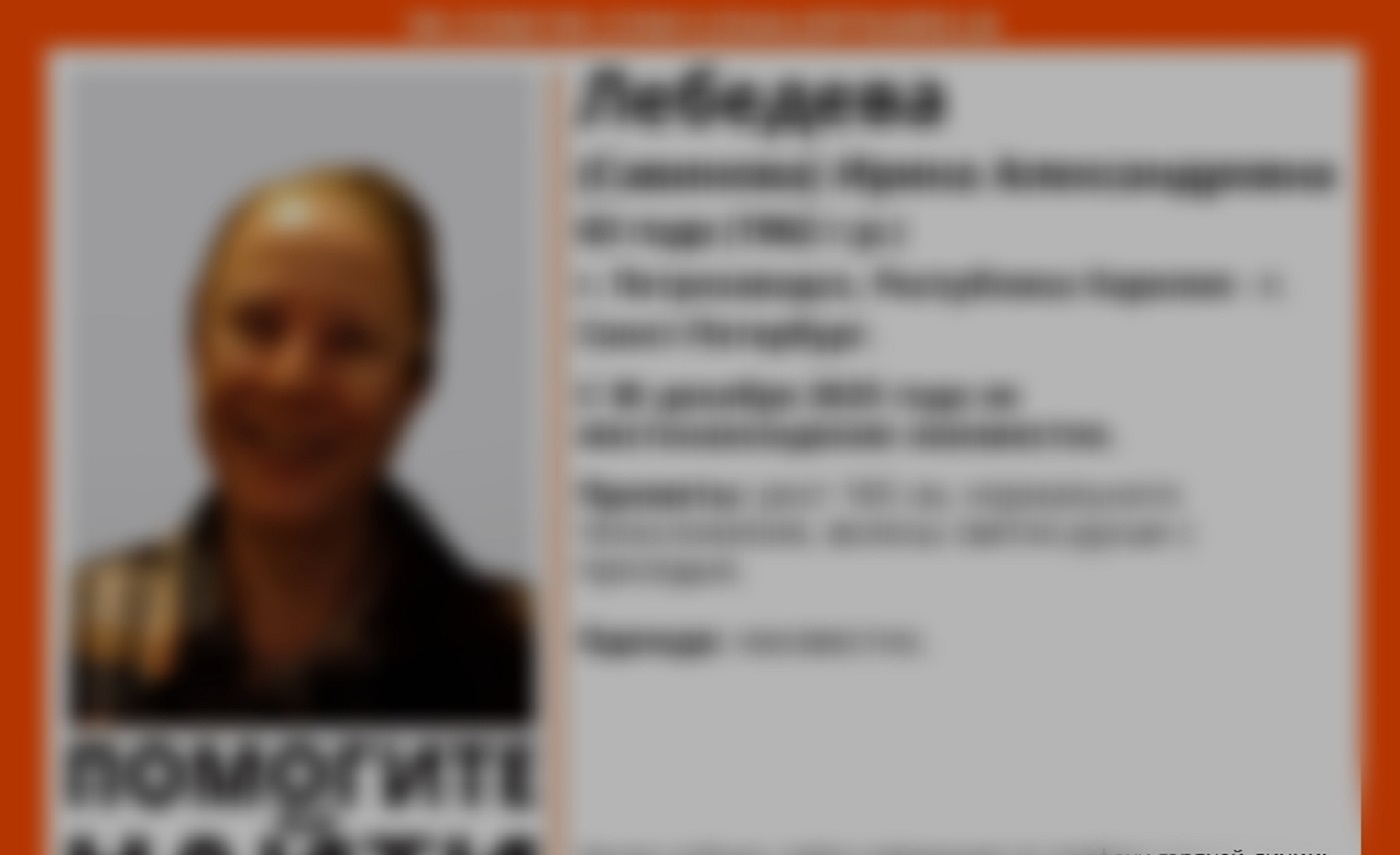 Пропавшая перед Новым годом жительница Петрозаводска Ирина Л. найдена живой. Об этом сообщили в поисково-спасательном отряде «ЛизаАлерт».