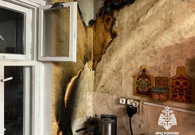 В МЧС Карелии сообщили, что для ликвидации пожара привлекали три едины техники и девять человек. Огонь повредил 2 квадратных метра кухни. Последствия возгорания показали в МЧС. // фото телеграм-канал МЧС Карелии