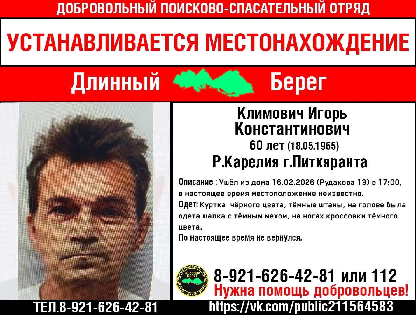 В Питкяранте волонтеры ищут Игоря Климовича