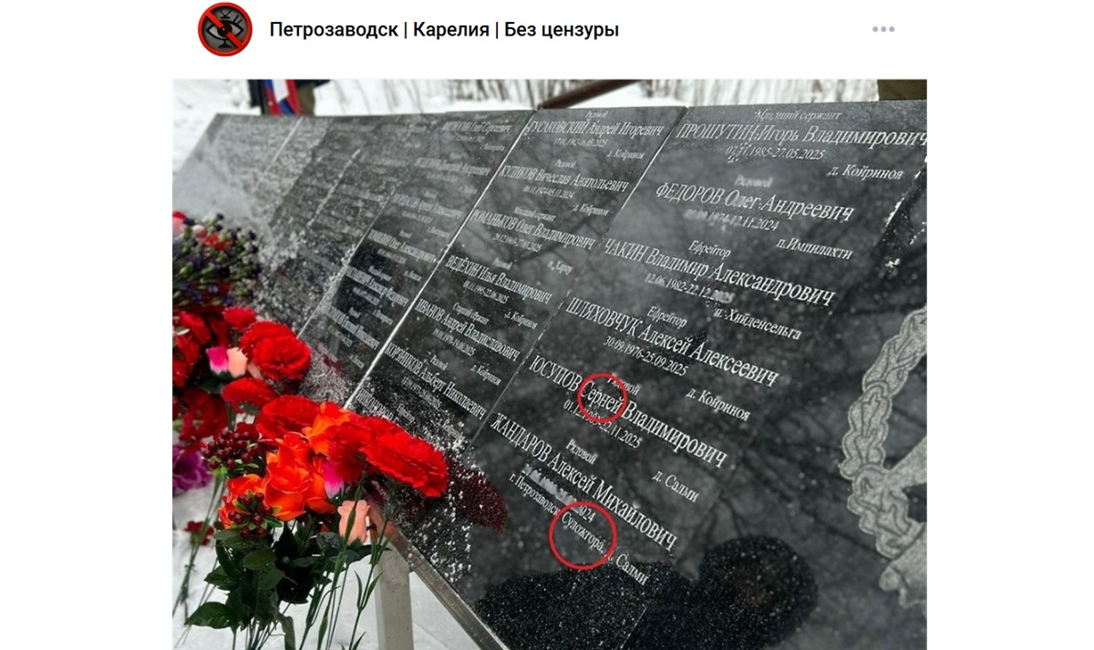 «Местные жители сразу обратили внимание на опечатки: «Прошу обратить внимание и исправить допущенные ошибки: Гусаковский Андрей Игоревич, похоронен в Ууксу, Юсупов СерНей Владимирович». «СулАжгора, а не СулОжгора; поселок, а не деревня Салми». «Мой сын Юсупов СерГей Владимирович! Очень обидно и горько! И он из д. Ряймяля, а не из Салми!» — написала мама погибшего бойца»,