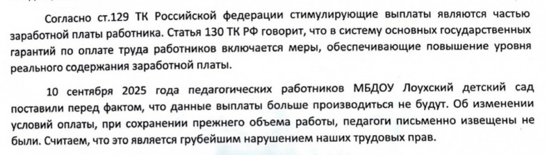 В Лоухском детском саду знают об этом обещании, но оно не отменило коллективноое письмо в Заксобрание Карелии. Воспитатели хотят добиться проверки и получить ответы на свои вопросы. На каком основании были отменены все стимулирующие выплаты, каким нормативным актом это закреплено? Почему изменение условий оплаты труда было произведено в одностороннем порядке? Какие меры приняты или будут приняты для устранения данных нарушений, включая перерасчет и выплату всех задолженностей по заработной плате?