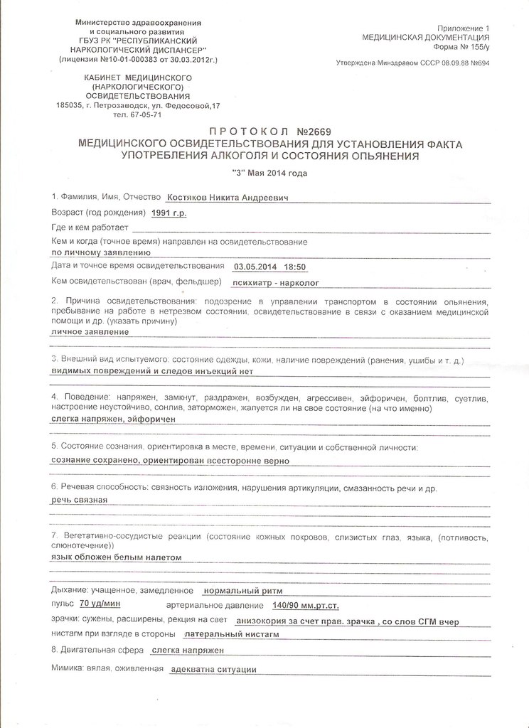 Мать автора скандального видео на своей странице в соцсетях выложила документы, которые говорят об обратном. Как показала экспертиза, в организме молодого человека не было следов каких-либо наркотиков. «Трезв, признаков употребления наркотиков не выявлено», – написано в заключении.