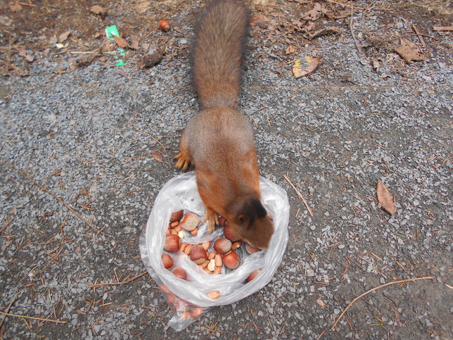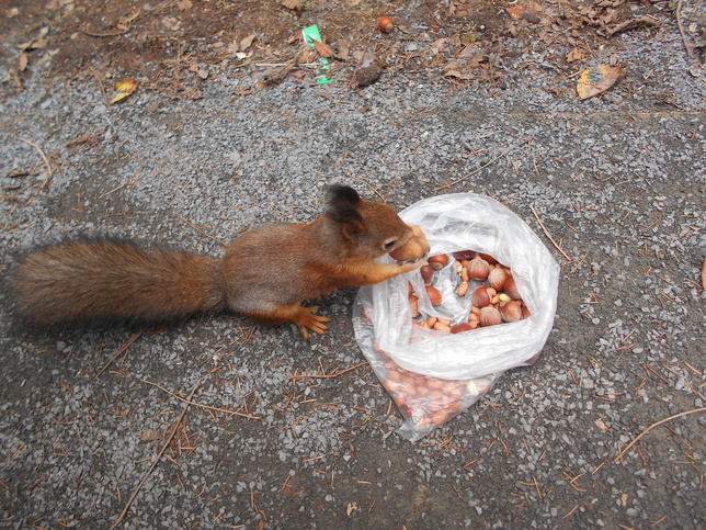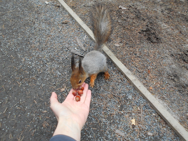 К белкам все гуляющие там привыкли настолько, что иногда не замечают их, снующих под ногами или между колесами колясок. Правда, иногда наглость этих пушистых зашкаливает – они залезают на «кормильца», заглядывают в коляски. Ну, тем и забавнее, особенно детям. Взрослым же удивительно другое – недавно белка из пакета с орешками стащила кусок недоеденной шоколадки, размером 3 х 5 сантиметров. Надеюсь, у не случилось несварения желудка.
