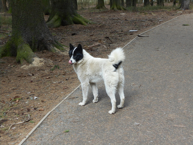 И вот примерно 2 недели живет еще одна зверушка в этом лесу. Это собака, помесь лайки. Умная и хитрая. Появилась неизвестно откуда и уходить к хозяевам, похоже, не собирается. В лесу у собаки цель – достать белку! Пёс целыми днями бегает по лесу с задранной головой. А когда найдет на дереве рыжую шкурку, ложится и терпеливо ждет. Или с громким лаем пытается запрыгнуть на дерево. При этом птицы собаку не интересуют. Кормить белок стало проблематично – лайка слышит позывное цоканье человека для белок и тут же оказывается рядом. На этом угощения заканчиваются. Собака добрая и умная, быть может, ее ищут хозяева.