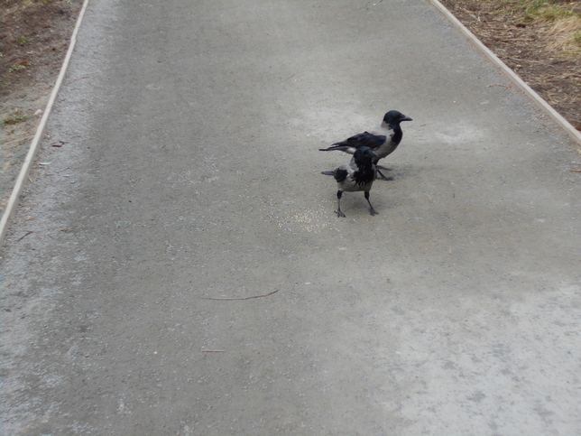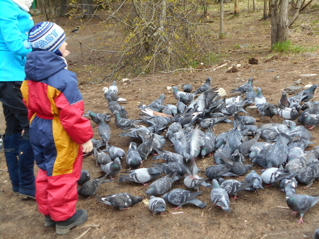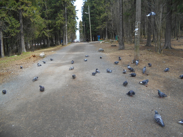 Как и положено – где есть халявная еда, там и нахлебников хватает. Это я о птицах в том же волшебном лесу. Кстати, на уроках биологии в школе нам не рассказывали, что голуби, оказывается, могут жить в лесу. Белкам они, конечно, не конкуренты, но вот с бесчисленным количеством ворон идет настоящая война. Каркуши насмерть давят голубей и откапывают орехи там, где белка их только что закопала!