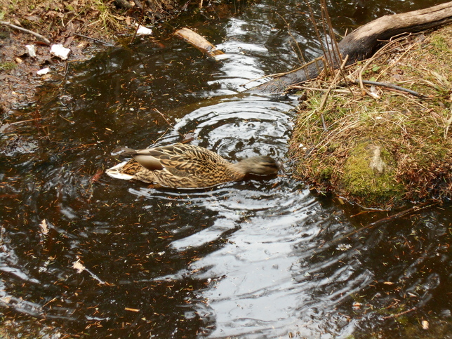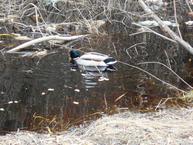 Самые спокойные – дятлы и утки. Последние в количестве около десятка пар поселились в здешних лужах так надолго впервые. Особо не боясь, они ходят и по нашим отсыпанным тропинкам. Ну, не по лесному бурелому ведь ласты таскать!