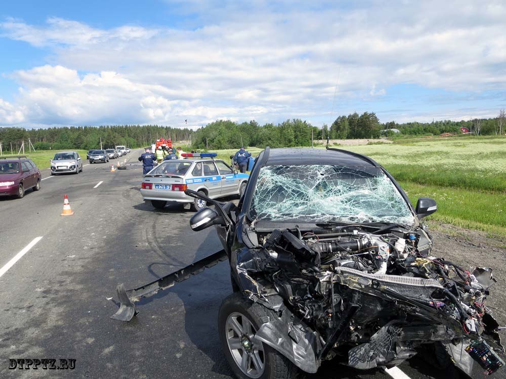Как сообщает сайт dtpptz со ссылкой на ГИБДД Карелии, авария произошла сегодня в 9-30 утра. Водитель автомобиля «ВАЗ — 2109» при обгоне колонны автомобилей по встречной полосе создал аварийную ситуацию. Водитель автомобиля «Ховер», во избежание лобового столкновения, принял решение увести автомобиль на обочину. К сожалению, аварии избежать не удалось. «Ховер» занесло на встречную полосу движения, где произошло столкновение с микроавтобусом «Мерседес — Спринтер» и «Ауди».
