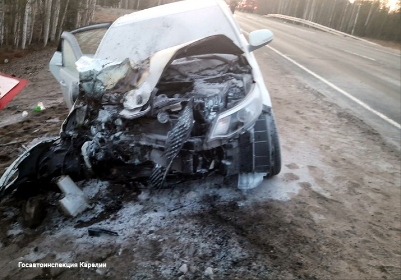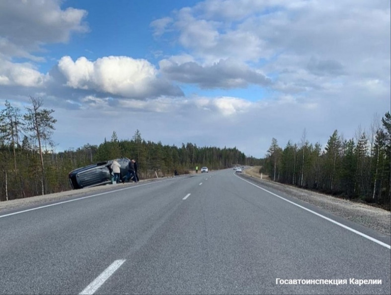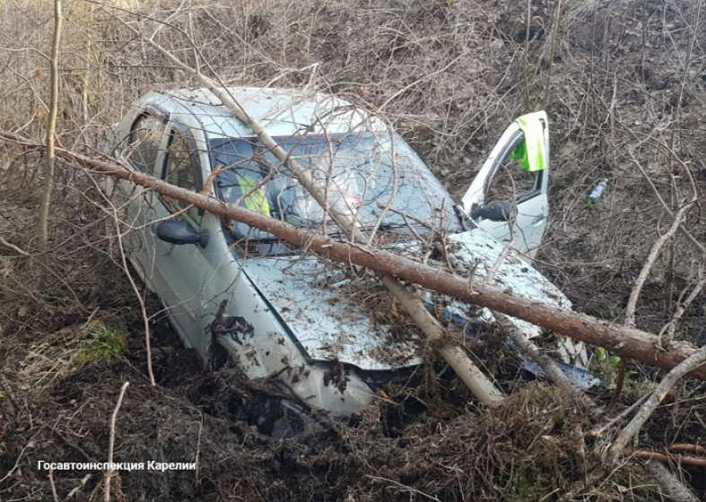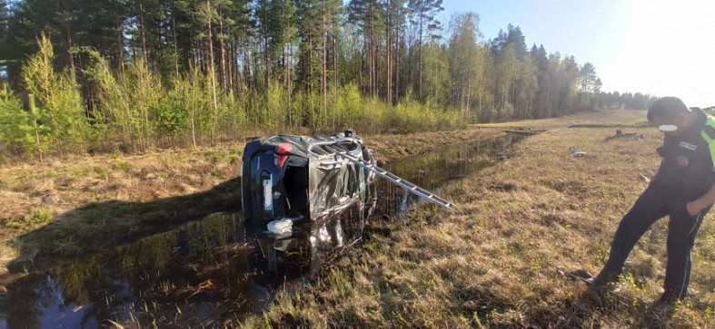 Автомобиль с питерскими номерами вылетел с трассы и окунулся в канаву в Карелии. Авария произошла вечером 15 мая в Пряжинском районе на трассе А-121.