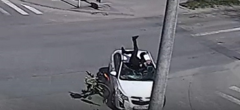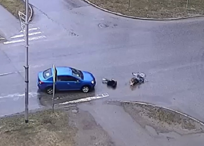 На кадрах видно, как мотоцикл влетел в легковой автомобиль, выполнявший левый поворот. Все случилось в 12:34 на пересечении улиц Ленина и Советской.