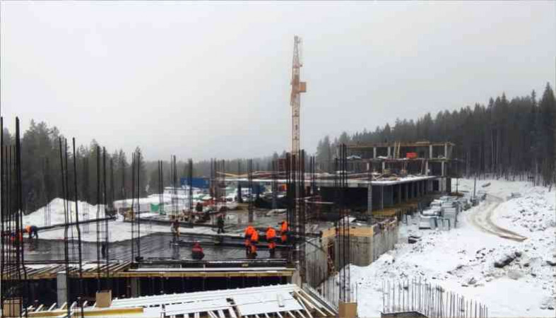 Основные работы на строительной площадке – монтаж монолитной коробки здания. Параллельно ведутся работы по устройству внутренних и наружных инженерных сетей.