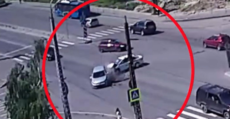 На кадрах видно, как автомобиль, выполнявший левый поворот, не уступил дорогу машине, ехавшей прямо. Случилось столкновение, после которого транспортные средства отбросило в разные стороны, один из автомобилей вылетел на тротуар.