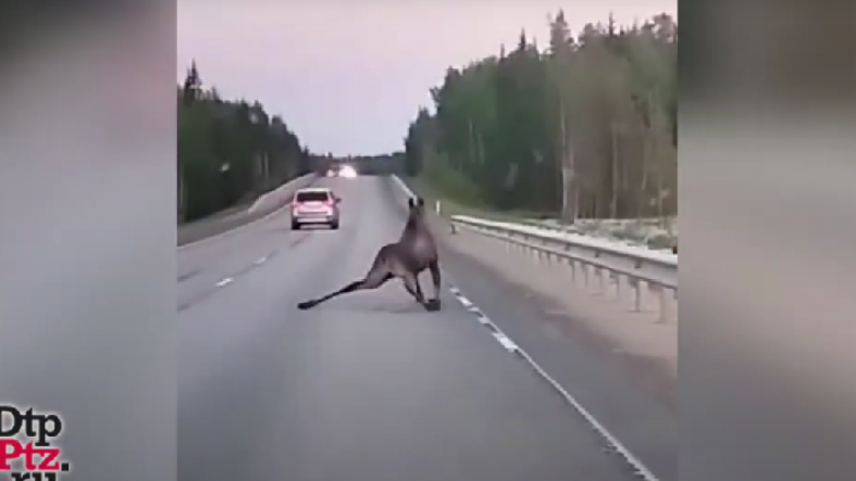 Спасло только то, что животное преодолевало отбойник и поскользнулось. Лось буквально сел на шпагат и тем самым дал возможность избежать серьезного ДТП. // фото, видео: dtpptz.ru