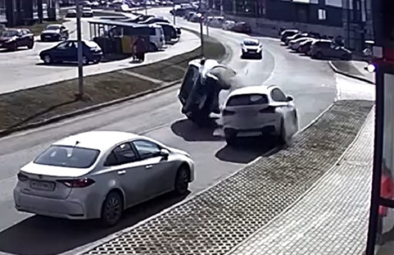 На кадрах видно, как легковой автомобиль врезается в припаркованный внедорожник и переворачивается.