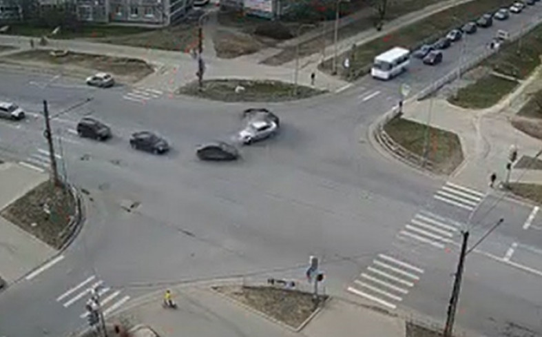 Автомобили получили механические повреждения. Дорожный инцидент попал в объектив городской камеры видеонаблюдения CityLink. // фото участников паблика «ДТП Петрозаводска и Карелии»