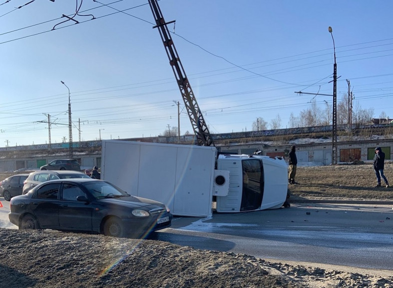 Участниками аварии стали внедорожник и грузовой автомобиль. В результате ДТП грузовик протаранил столб. Опора накренилась, а транспортное средство опрокинулось.