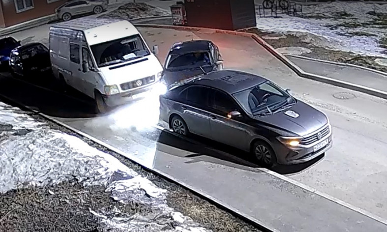 На записи видно, как легковой автомобиль едет по двору и внезапно таранит микроавтобус и другую легковушку, припаркованные у края проезжей части. После этого виновник происшествия как ни в чем не бывало покидает место ДТП. // Фото: скриншот видео Sampo.ru