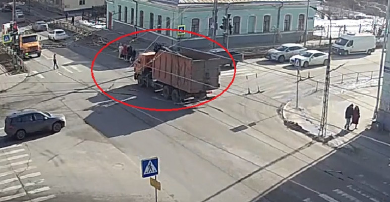 Пешеходы начали переходить проезжую часть, но вынуждены были остановиться из-за двигавшегося прямо на них грузовика. Водитель КамАЗа снизил скорость, но не остановился и завершил маневр. Пропускали грузовик не только пешеходы, но и те, кто двигался на автомобилях в сторону площади Кирова. Судя по кадрам, опасная ситуация произошла 6 апреля в 09:38. // фото скриншот