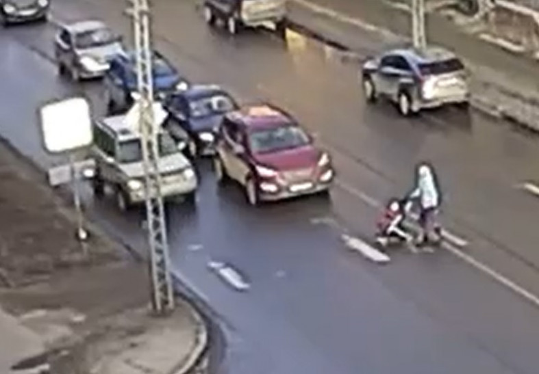 Инцидент произошел 30 марта на проспекте Александра Невского и попал в объектив камеры наблюдения. На кадрах видно, как автомобили левого ряда остановились, чтобы пропустить пешехода с коляской. В то время как двигавшийся по правому ряду водитель и не думал тормозить.
