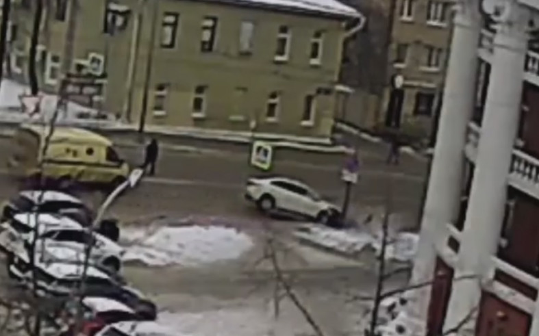 На кадрах видно, как микроавтобус останавливается перед пешеходным переходом, чтобы пропустить человека. В этот момент ехавший сзади легковой автомобиль резко объезжает его и врезается в опору.