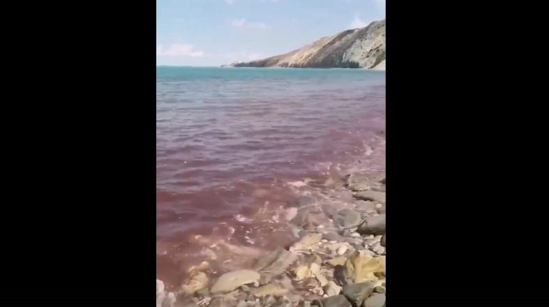 К берегу могло прибить водоросли красного цвета, что повлияло на цвет морской воды. Опасности для отдыхающих нет