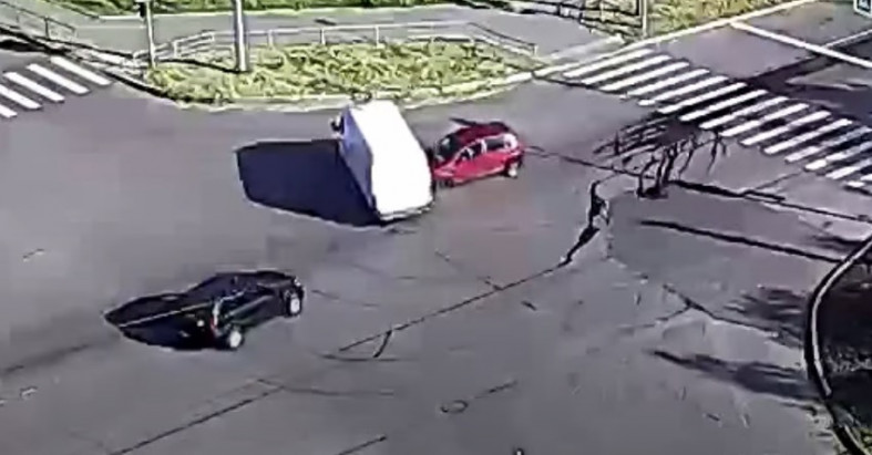 Вечером 30 июня камера наблюдения CityLink запечатлела столкновение фургона и легкового автомобиля. Одно транспортное средство поворачивало налево, а другое двигалось в прямом направлении. Машины получили механические повреждения. (фото скриншот)