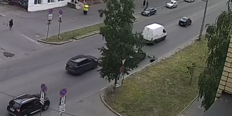 На кадрах видно, как мотоциклист, уходя от столкновения с легковым автомобилем, теряет управление и падает на дорогу. Водитель мотоцикла смог самостоятельно подняться и дойти до тротуара. Ему на помощь бросились прохожие.