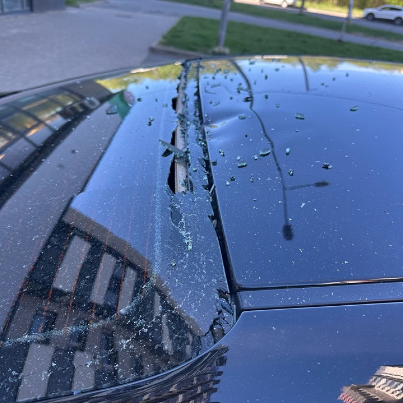 В результате падения на автомобиле осталась вмятина и оказалось разбито заднее стекло. // фото и видео из VK-сообщества «Петрозаводск Live»