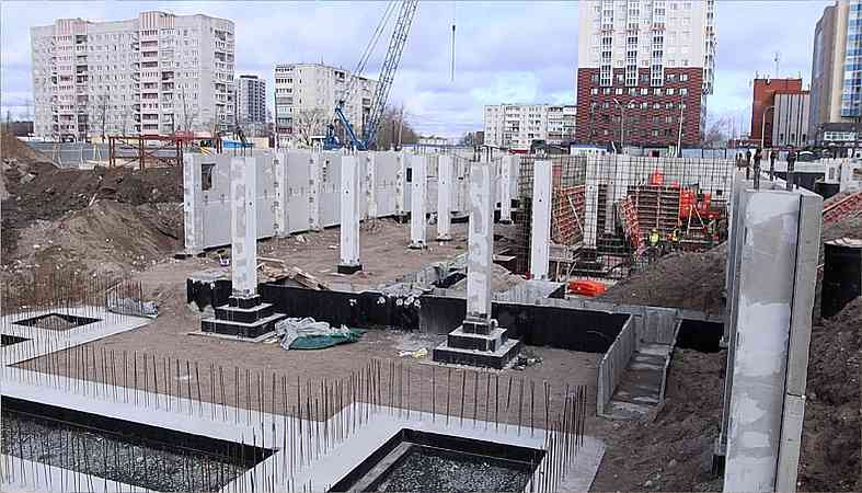 На объект строители зашли в конце января текущего года. За прошедшие три месяца выполнены работы по разработке котлована, устройству фундаментов, смонтированы все железобетонные колонны цокольного этажа, порядка 70% наружных стеновых панелей цоколя, 90% конструкции монолитных стен цокольного этажа, так же на 90% смонтирован наружный пристенный дренаж. Ведётся обратная засыпка и уплотнение грунта для устройства полов подвала.