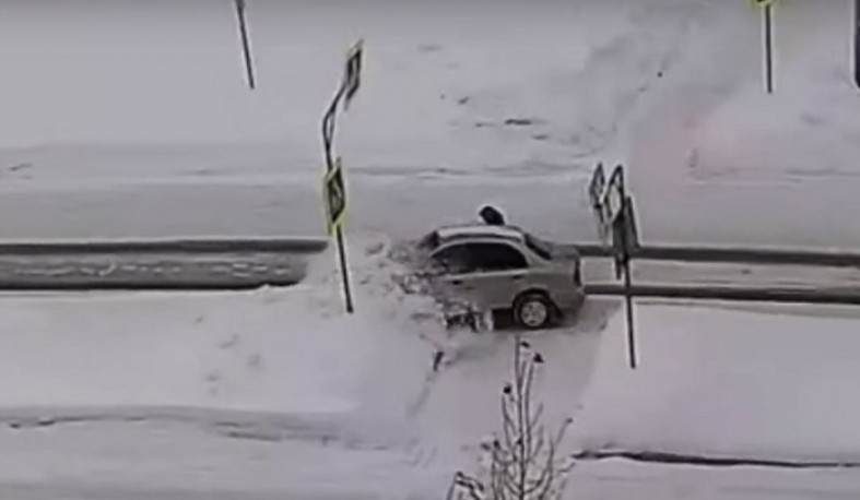 Водитель увел легковой автомобиль в сугроб, чтобы избежать наезда на переходившего дорогу человека. Опасный момент попал в объектив камеры наблюдения CityLink. Ролик разместила группа «Сегежа слушает/ Online».